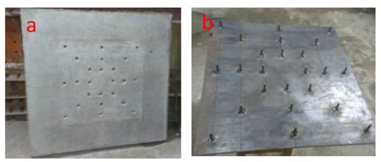 The purpose of testing the reference plate specimen is to estimate the ultimate loading and deflection features. Before strengthening, all plates are loaded up to half the ultimate load of the control samples. When the concrete reaches an age of 8 weeks, the plate tension surfaces are penetrated using drills to allow steel plates with shear bolts to be placed beneath, as shown in Figure 7a. Using a hammer drill, the slabs undergo pre-drilling in light of a specific bolt distribution. Next, the plate surface is roughened using steel brushes to weld the steel shear bolts onto the plates at the specified locations, as illustrated in Figure 7b. After this process, a vacuum cleaner is used to clean the plate surface and holes carefully. The steel plate surfaces are checked to ensure that they are free from oil and dust using a suitable solvent to prepare them for applying the two-part epoxy adhesive. Next, the steel plate is bonded onto the concrete surface at the bottom (tension) side using the epoxy bonding agent. Finally, the steel bolts are put into the epoxy adhesive (using the same bonding material) before being inserted inside the holes. A curing period of (7) days is followed before testing the strengthened plates.