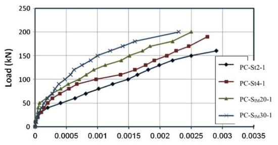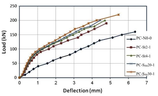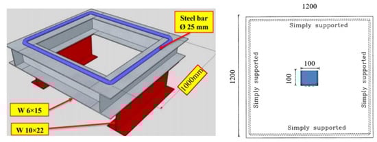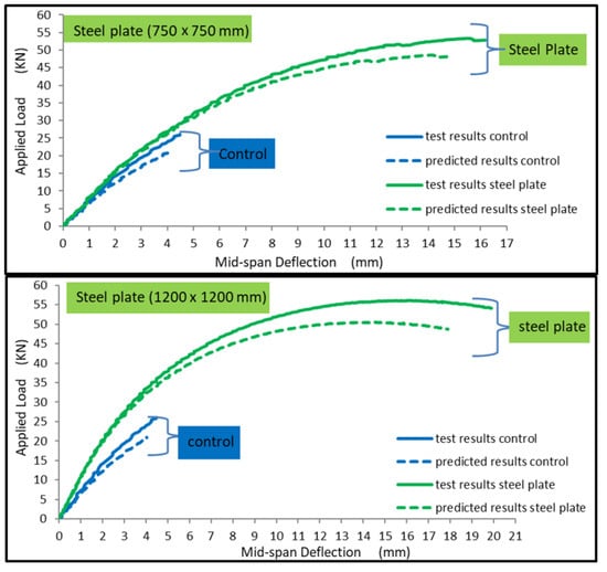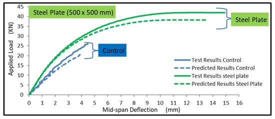 Steel plates are commonly applied to strengthen reinforced concrete beams and slabs. The plate bonding method has attracted the attention of many researchers over time, as it is considered to be a simple and fast method that results in minimal increases in terms of structural self-weight and size. Elbakry and Allam [] studied, both experimentally and analytically, the punching shear strength of RC two-way slabs strengthened with steel plates. Better results were obtained for the strengthened slabs in terms of stiffness and punching shear strength, which is mainly determined by the plate dimensions, stud diameter, and arrangements. The increase in punching shear strength after steel strengthening is predicted analytically using the proposed approach. The latter was applied to the test specimens using the punching shear equations adopted in a number of codes of practice. Zhang et al. [] found that two-way reinforced concrete slabs can be efficiently strengthened using external steel plate bonding. Sim and Oh [] experimentally demonstrated how using external bonds of steel plates when strengthening RC bridge deck panels under punching load leads to a substantial increase in the load-carrying capacity and flexural stiffness.