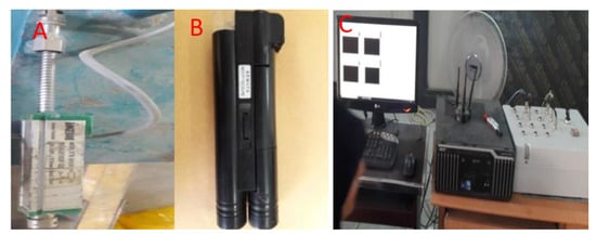 Instruments provided for testing, (A) LVDT of 50mm capacity, (B) Microscope for measuring the crack width, and (C) Data logger connecting to the computer to record data.