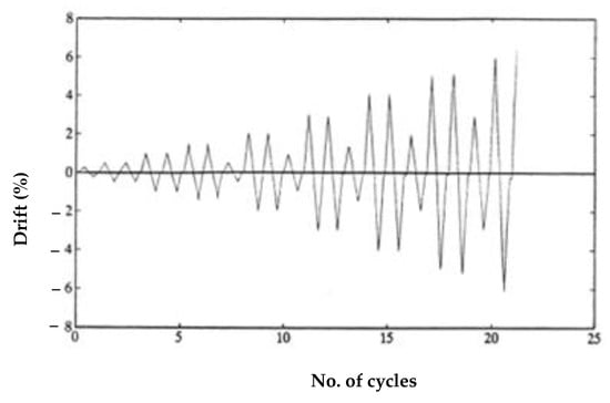 The pre-defined displacing routine includes about (20–22) cycles of displacement that are fully reversal. An incremental increase is seen in the peak displacement value until it fails, rising from a (0.25%) drift up to (7%). Figure 12 illustrates the drifting routine during the cyclic displacement in this experiment []. There are several initial displacements found as part of the drifting routine. The purpose of them is to study the slab’s initial elasticity response. All slabs undergo the exact same vertical loading sequences. Twenty cycles of repeated load are applied to five slabs. At every cycle, the connection is loaded slowly up to 70% of the ultimate load of the reference specimens, after which it is unloaded, as in []. Lastly, the specimens are loaded up to failure. Each load at the first crack, ultimate punching shear/bending load, and corresponding deflections at the slab center are noted as part of the experiment’s observations and records. Figure 13 illustrates the set-up of the slab specimens mentioned.