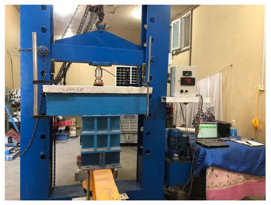 In this type of loading test, the slabs are labeled and put along the edge onto the simple support. The specimens were centrally loaded using a loading plate with dimensions of (100 mm × 100 mm). The lifting, horizontal installation, and removal of specimens out of the loading frames were done using a 10-ton capacity crane (see Figure 11). During the cyclic loading test, hydraulic jacks that are placed at the bottom of the plate specimens are responsible for loading the slabs from a mid-point upwards. The applied load is measured using the additional load cell that is put between the jack and the sample. The load application is performed using high-strength steel plates that have a dimension of (100 × 100 × 10 mm). They are put onto the contact points, as shown in Figure 11.