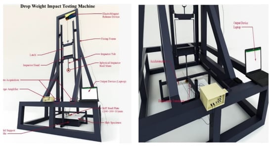 Moving forwards to the impact loading tests, this type of loading was achieved through free fall, dropping a weight from a height of (1.5 m) (see Figure 14). The dropped weight slides between tracks from the drop tower to impact the specimen at its center point. The semi-spherical impact hammer head utilized in this process is made from high-strength steel. The constants throughout the test are the drop height, hammer weight, and geometry of the hammerhead. Local fracturing is prevented using high-strength steel plates of (100 ×100 × 10 mm), which are put over the contact points for distributing the load identically to the ones used in cyclic tests. In addition, polyurethane rubber parts are put between the loading plate and the specimen. The slab specimens are put in the impact loading testing set-up using the special steel supporting devices in this experiment.