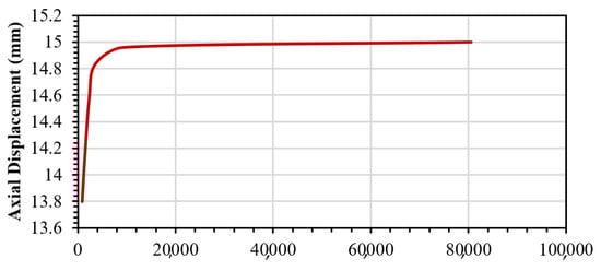 It has been observed that the majority of the mesh intensity determined the analysis complexity levels and processing timespan. It was, therefore, necessary to perform a preliminary analysis of different mesh densities to determine the best mesh density which would provide the desired accuracy. In practice, this is achieved whenever increasing the mesh density does not influence the outcomes. To study convergence, the number of elements was increased in each of the X, Y, and Z directions. The plates were modeled while decreasing the element size (30, 25, 20, 15, 10, and 5), with the number of elements being (891, 1400, 2300, 3484, 9500, and 80,600), respectively. Another aspect noted during observation is the axial displacement for the same applied loading levels. The convergence study shows that reducing the mesh size from (10 mm) to (5 mm) enables the change in axial displacement to be neglected. The axial displacement value increases in accuracy with experimental data (see Figure 15). Therefore, a 10 mm element size was set for the mesh density, guaranteeing that the element size and the numerical solution stability are adjusted reasonably.
