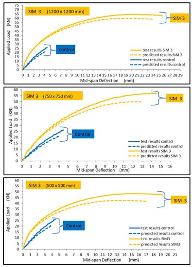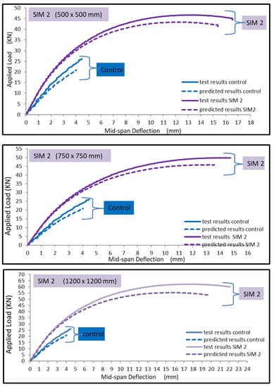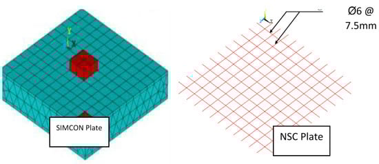 A number of studies have examined the effect of SIMCON strengthening on the structural behavior of specimens. Krstulovic-Opara [] created SIMCON models for tension and compression and showed that SIMCON could be potentially used for repairing and retrofitting structures that already exist [,]. Balamuralikrishnan and Jeyasehar [] investigated the flexural strength of reinforced concrete beams both experimentally and analytically using externally bonded SIMCON laminates. The prediction of the theoretical moment-curvature relationship of specimens and the load-displacement response of beams (strengthened and controlled) was performed using the FEA software ANSYS. By comparing the numerically obtained results to the ones obtained experimentally and theoretically, it was concluded that a higher flexural strength and stiffness, as well as composite action until failure, was found for the strengthened beams. Harris [] tested 12 square Reactive Powder Concrete (RPC) slabs of dimensions (1143 × 1143 mm) to investigate the boundaries between flexural and punching shear failures. The main factor taken into consideration is the slab thickness (50.8, 63.5, and 76.2 mm). The slab support in all cases is found to be on the end that is fully restrained, with a concentric loading. The conclusion was drawn that only small loading areas were needed for forcing punching shear failures in RPC slabs when dealing with small plate tests, taking into account the flexural capacity and deflection criteria.