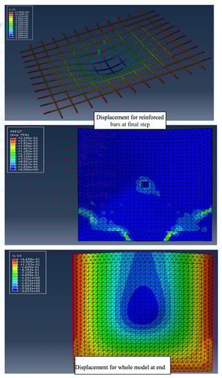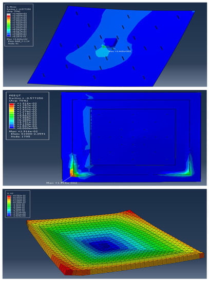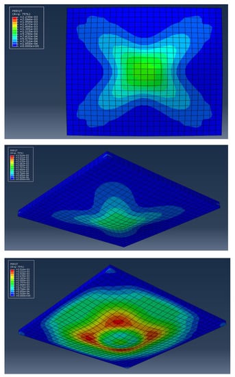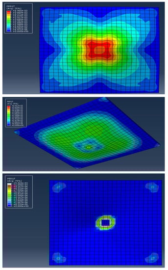 The structural analysis of the plates was performed using a single impact and general cyclic analysis step. The modeling of NSC plates strengthened with either SIMCON or steel plates involves three-dimensional solid elements that are marginally integrated into the concrete modeling using 8-node brick elements (C3D8R). In NSC plates, the reinforcement involves a three-dimensional two-node truss element (T3D2). A consistent pressure was applied to each slab’s top, whereby the slab remains fixed at its outer edges, restraining displacement in all directions (X, Y, and Z axes). The center of the slab remains restricted to movement on the X and Z axes, whereas the displacement is not restricted in the direction of the slab’s vertical axis (Y-axis). The top of the slab undergoes a uniform loading, as demonstrated in Figure 16.