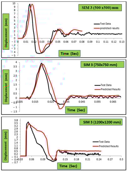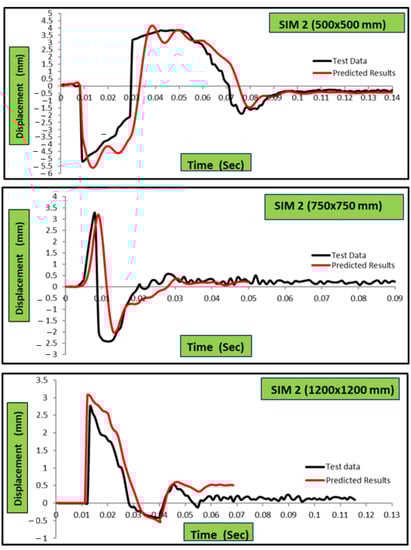 - The increase in the area of SIMCON from 500 × 500 mm to 1200 × 1200 mm reduced the maximal displacement value of the test specimens. The results indicate that full-scale SIMCON-strengthened plates have remarkably lower damage rates under impact energy levels, withstanding higher impact energy values.
