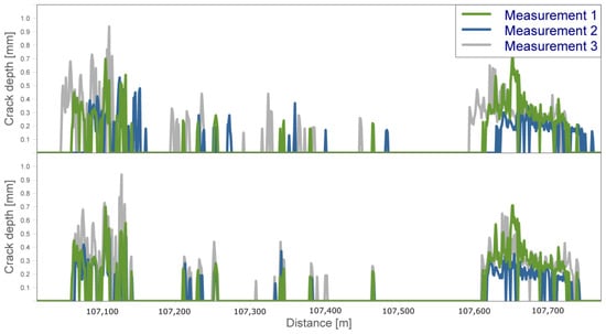 Since the data in Figure 2 and Figure 3 are the same, it becomes clear why two of the testing campaigns have a different characteristic than the others. The reason is the maintenance carried out between the testing campaigns in 2014 and 2015. This is also in line with ÖBB’s maintenance regime, as cracks with a depth of more than 1 mm were detected during the campaign in 2014. Despite fully removing the cracks in the maintenance operation, they started to grow again and were first visible in the testing campaign in 2015. Thereby, crack growth does not occur linearly, but apparently exponentially over time. The example shows that eddy-current testing can yield stable time series if data are processed appropriately.