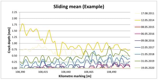 The final step of the data preparation was to define a quality index which could be used for the time series analysis. To make the data easier to interpret, the noise of the raw data was reduced. This was done by calculating the sliding mean of the signal, based on a window width of 5 m and a reduction interval of 1 m. If this calculation was applied to all testing campaigns of a curve, the signal characteristics result in Figure 2.