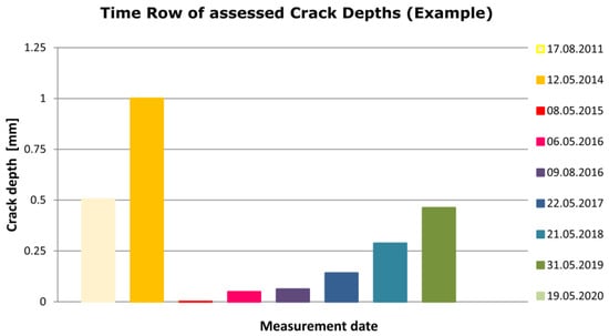 There are nine testing campaigns included in the figure, identifiable by their different colour. Seven of the campaigns show a similar characteristic with slightly deeper cracks at the end of the curve rather than at the beginning of the curve. Two campaigns (2011 and 2014) show a completely different characteristic with deeper cracks at the beginning of the curve. Simultaneously, the crack depth was generally higher for these testing campaigns. A further analysis of how crack growth differs within curves could lead to a better understanding of crack growth behaviour, but is not the subject of this paper. For the purpose pursued, which is the time series analysis, a further step of simplification was necessary, as one quality index per testing series was needed. Therefore, we then calculated the mean value of the signal over the entire curve. This led to an index (crack depth) for each testing campaign, which is shown in Figure 3 for the same curve as before.