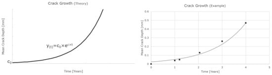 We can state that the testing frequency, in our case one time per year, is not sufficient to move towards predictive maintenance in practical application. This is mainly due to the deterioration function itself; the forecasting becomes important when the crack starts to grow faster and, thus, moving into the steep part of the e-function. Therefore, more frequent testing results are needed to capture both the point in time of this change in the characteristic of the crack growth and the velocity of the crack growth in this part of the function. Moving towards a predictive maintenance regime requires a minimum of three testing campaigns per year.
