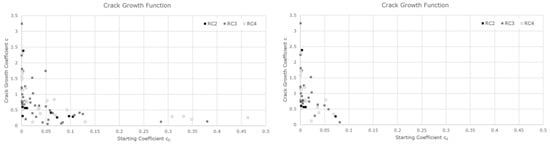 In the first step, we calculated the crack growth regression function for all the selected deterioration periods. The left part of Figure 5 depicts the wide range of the values. Starting coefficients c0 higher than 0.1 are not realistic as the cracks were totally removed within the grinding operation at ÖBB. Furthermore, we saw that the deterioration periods with missing data points in between give a high uncertainty; we cannot ensure that these periods have been maintenance free.