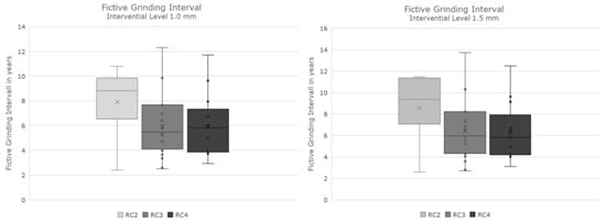 Fictive grinding interval for an alert limit of 1 mm (left) and 1.5 mm (right).