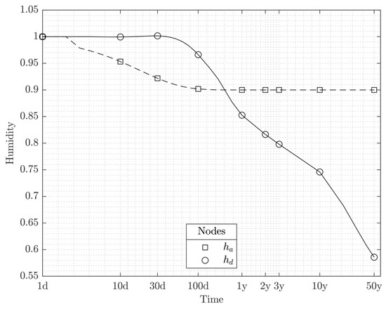 where h is the internal relative humidity, h = h ( x , y , t ) , h d is the drying humidity, and h a is the autogenous humidity. The change in drying humidity is the moisture loss due to the evaporation of water towards the outer environment. On the other hand, the change in autogenous humidity is due to the chemical process of cement hydration after the initial setting without taking into account any volume reduction caused by load, thermal, or moisture effects; this process is also called self-desiccation of the hardened structure. It consists in consumption of capillary water by hydration reaction [18,19].