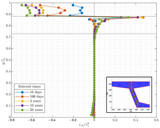 A significant shrinkage strain gradient is recorded in the overlay; the section at the top and the one closer to the interface with the substrate show high levels of strain, while the intermediate region experiences shrinkage of a smaller magnitude. As a matter of fact, the average compressive strain recorded in the overlay is 0.38 ε s 0 after 100 days and 0.65 ε s 0 after 50 years, while the maximum predicted compressive strains are about 0.55 ε s 0 after 100 days, 0.60 ε s 0 after 3 years, and 0.70 ε s 0 after 50 years. An increase in shrinkage strain can be observed with time, although at a slower rate. Taking into account the swelling in the substrate close to the interface with the new concrete layer, the average value calculated after 100 days is about 0.051 ε s 0 and it reaches 0.041 ε s 0 after 50 years. The maximum recorded swellings are 0.47 ε s 0 after 100 days, 0.53 ε s 0 after 6 months, 0.46 ε s 0 after 3 years, and 0.33 ε s 0 after 50 years, showing an initial increase and then, after 1 year, a decrease in magnitude.