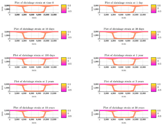 The behavior of humidity and shrinkage is not quite the same in terms of the rate of change. At the beginning, say 10 days, the change in relative humidity is about 0.05 (Figure 5), whereas the change in shrinkage strains is 0.2 ε s 0 = 176 μ ϵ , which is a significant magnitude of shrinkage (Figure 7). If this strain is restrained at this very short age of the overlay, the probability of cracking might be significant, since at 10 days, the strength of the concrete is low. On the other hand, at late ages, say 10 to 50 years, the internal humidity is still changing (see Figure 4) for 10 and 50 years, while for shrinkage strains, the change is not significantly different (see Figure 8) for 10 to 50 years. This analysis confirms that for practical applications or standard designs, an analysis of about 10 years seems to be adequate, leading to a reduction in computational work for the prediction of stresses, probability of cracking, or displacements due to restrained shrinkage of new concrete overlays.