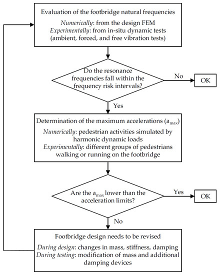 Flowchart for the footbridge comfort assessment during the design and testing phases.