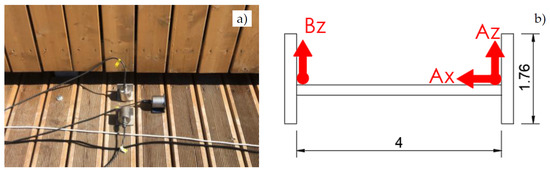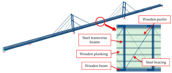 The present work was developed considering a newly built cable-stayed wooden and steel footbridge located in Central Italy as a case study (Figure 2). The footbridge is 233 m long and serves as a walking and cycling link between two municipalities divided by a river. The deck is 4 m wide and is built with wooden planking supported by steel transverse beams and steel truss cables, the latter working as a bracing system. The whole deck is supported by two lateral wooden beams which also have the additional function of parapets. The footbridge is composed of five spans. The external spans, with a length of approximately 25.5 m, are simply supported on the abutments and on piers; the three internal spans, with lengths of 52 m, 78 m, and 52 m, are supported by stays and by transverse steel beams located in parallel to the two steel portals and the two piers. The portals are approximately 23 m high and made of “Corten” steel profiles. The connection between the deck and stays is assured by steel beams bolted to the wooden beams on the bottom side of the deck. A geometric scheme of the footbridge, with the main dimensions, is provided in Figure 2c.