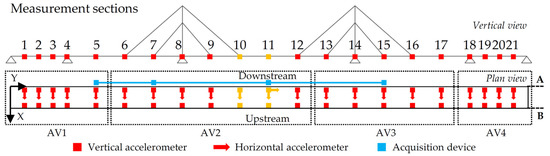 The footbridge was divided into 21 instrumented sections to capture the global dynamic behavior of the structure, namely, its bending, longitudinal, transverse, and torsional vibration modes. In total, 20 measurement sections were instrumented with three accelerometers (Figure 3), two measuring in the vertical direction and one in the transverse direction, while 1 measurement section (n. 11) was instrumented with four accelerometers, two in the vertical, one in the transverse, and one in the longitudinal direction. The accelerometers were positioned close to the wooden beams to record the maximum torsional accelerations. Moreover, given the technical difficulties involved in fully instrumenting the bridge at the same time, four consecutive AVTs were performed with the same sampling rate of 1024 Hz and the same time length of 40 min. From the first (AV1) to the last test (AV4), the sensors were moved along different measurement sections to cover all the footbridge, as described in Figure 4. Only sections n. 10 and n. 11 (highlighted in orange in Figure 4) were never moved during the tests; thus, they were used as a reference for the reconstruction of the global mode shapes. To reconstruct the mode shapes from the dataset recorded during each test, the PoSER (Post-Separate Estimation Re-Scaling) procedure was employed [51].