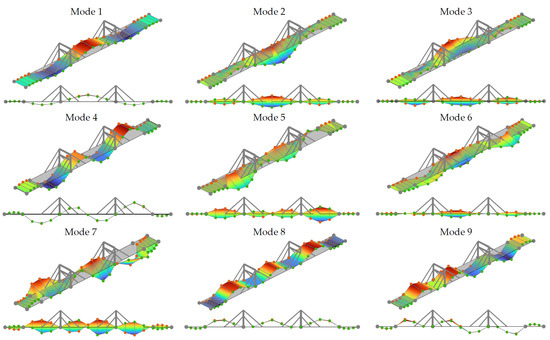 For the sake of brevity and for reasons linked to the pedestrian-induced load tests (as will be addressed further below), only the modal parameters of the first nine vibration modes are reported. Table 2 collects the identified resonance frequencies and damping ratios, together with a mode explanation; the frequencies and damping ratios are calculated as the average between the values obtained from the four identifications performed. Figure 6 shows the relevant mode shapes. Here, the footbridge geometry is distorted to render the modal deformations simpler and understandable. Figure 7 depicts the AutoMAC matrix; the very low values off the diagonal demonstrate that the identified modes are almost completely decoupled, confirming the accuracy of the adopted measurement configurations, as well as the quality of the measurements and the adopted identification procedures.