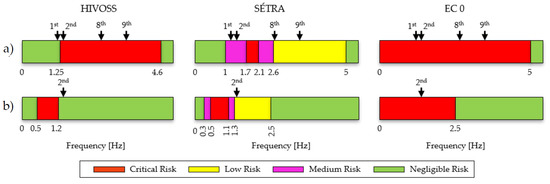 Frequency risk intervals proposed by Hivoss, Sètra, and EC0: (a) vertical (bending and torsional) modes, (b) transverse modes.