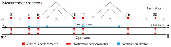 The adopted instrumentation was the same as that used for the AVTs. Furthermore, according to the Hivoss prescriptions, the measurement sections were placed in positions where the maximum accelerations were expected; thus, seven measurement sections were applied, as detailed in Figure 9.