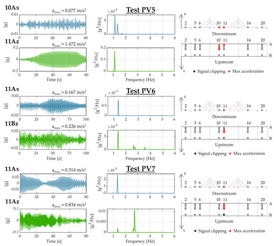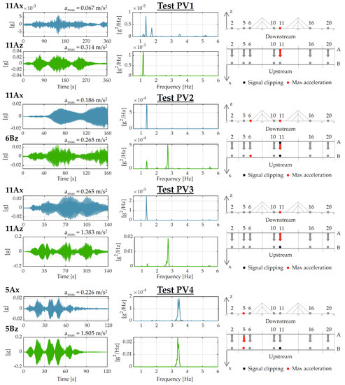 The main codes and guidelines serve to control the recorded maximum accelerations with the suggested limits. Therefore, the acceleration time histories measured in the vertical and horizontal directions, together with the maximum values and the PSDs of the signals, are reported in Figure 10 and Figure 11 for tests PV1–PV7. For each test, only the acceleration time histories and the relevant Power Spectral Densities (PSDs) of the sensors, with which the maximum accelerations were recorded (vertical and horizontal), are shown. All data can be found in the Supplementary Materials. Furthermore, for each test, the geometric scheme of the footbridge is also reported to show the positions where the maximum accelerations were recorded (highlighted in red). It is worth observing that some sensors (highlighted in black) were affected by signal clipping during the tests, probably because the human input was applied too close to them. For almost all the dynamic tests, the higher accelerations were measured in correspondence with the mid-length of the central (and longer) span, where the tested modes attained their maximum modal displacements. Generally, the acceleration values for the horizontal direction are lower than those for the vertical one.