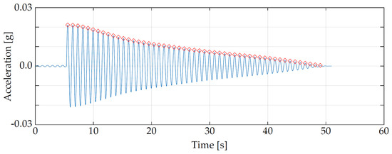 Test PV8 was performed to obtain an alternative estimation of the damping. The free-vibration recording after the jump test is shown in Figure 12 for sensor 11Az. The signal is obtained by band-pass filtering around the first frequency of the footbridge. The damping is calculated as the logarithmic decrement in the acceleration time history, adopting the following equation [53]: