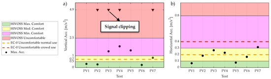 Regarding the horizontal direction (Figure 13b), only during three tests the accelerations exceeded the EC0 limit for normal use, while they never exceeded that relevant to crowd use during exceptional situations. Instead, the limits provided by the Hivoss and Sètra were always upheld, with only one case falling within the minimum comfort class.