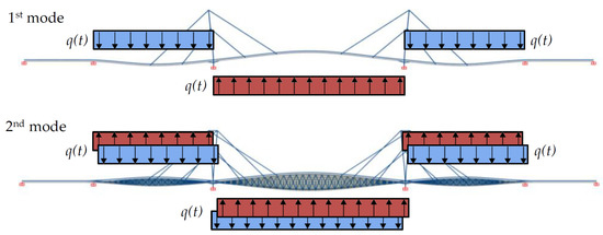 The Sètra prescribes the assessment of the vibration serviceability only in some cases, depending on the frequency risk intervals and on the footbridge class, as specified in Table 5 and reported in [36]. Footbridge classes vary from class IV (for rarely used footbridges) to class I (footbridges connecting densely populated areas). For the footbridge at hand, class III is the most suitable (a footbridge of standard use). Nevertheless, the Sètra prescribes that for class III, design under human-induced vibrations is not required; for this reason, we decided to move on to class II (a footbridge in a populated area). The frequency risk intervals are reported in Figure 8: the first mode frequency falls within the medium-risk class, while the eighth and ninth mode frequencies are within the low-risk class. The second mode is a torsional–transverse coupled mode; hence, it must be considered twice for both vertical and horizontal vibrations. For the former case, this mode falls within the medium-risk class, while for the latter, it falls within the low one. Considering that the structure is located in a suburb area and that the footbridge class was conservatively increased, the numerical serviceability assessment was performed only taking into account the modes falling into the medium-risk class (i.e., the first and second, with the latter only for vertical vibrations). Based on these considerations, two numerical analyses were performed considering the following parameters: d = 0.8 person/m2 and neq = 33.6 persons. The direction of the harmonic load for the two simulations was the same as that of the half-waves characterizing the mode shapes associated with the natural frequencies considered in the dynamic analysis. The harmonic loads assumed for the tested modes are shown in Figure 15.