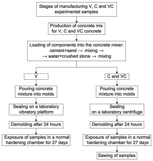 In total, according to the results of experimental studies, 150 sample cubes with a size of 70 × 70 × 70 mm for vibrated concrete were made. A similar number of samples were cut from prefabricated centrifuged and vibro-centrifuged concrete elements. In total, 450 concrete cube samples were made and cut.