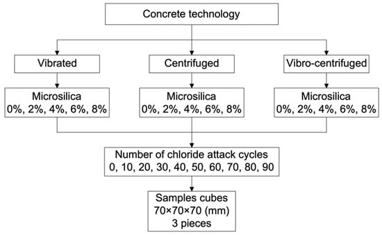 Our review revealed a lack of knowledge about the complex effect of technological and prescriptive factors on the durability of concrete under cyclic chloride attack. Thus, our study will examine the differences in the durability of concretes of various compositions used in structures operated in especially dangerous and high-risk conditions, i.e., to compare and evaluate the differences in the durability of conventional and variotropic concretes made using three different technologies: vibrating, centrifuging and vibro-centrifuging, and modified with the addition of microsilica, under conditions of cyclic chloride attack.