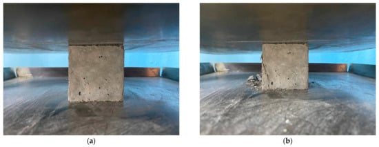 The compressive strength of experimental samples was determined in accordance with the requirements [] on an IP-1000 press (NPK TEHMASH, Neftekamsk, Russia). This procedure complies with the basic regulations for the manufacture and testing of concrete specimens given in the following European Regional Standards: