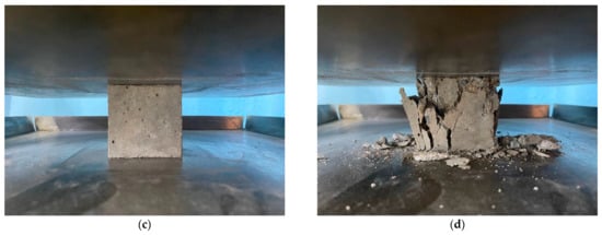 Photographs of tests of samples of variotropic (a,b) and ordinary vibrated (c,d) concrete for compressive strength before failure (a,c) and after failure (b,d).