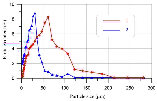 Distribution curves of microsilica particles before mechanical treatment (1) and after (2).
