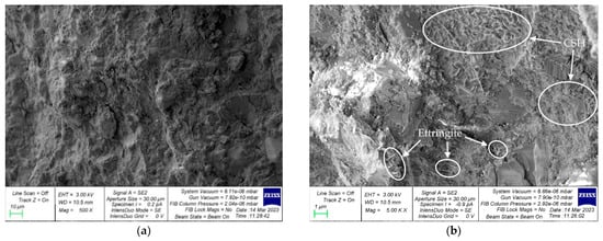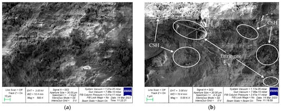 Modification of concrete with microsilica provides a denser matrix microstructure and also promotes the formation of additional calcium hydrosilicates (CSH), which fill the contact zones between the binder and the aggregate, thereby compacting the structure and increasing the strength of the concrete (Figure 13b, Figure 14b, and Figure 15b). In general, the mechanisms of the effect of microsilica addition on the change in the properties of both conventional vibrated concrete and variotropic concretes, centrifuged and vibro-centrifuged, practically do not differ and are expressed not only in an increase in hydraulic activity but also in the formation of crystallization centers by the smallest particles in the contact zone of cement, additionally increase the strength of hardened cement paste and concrete. The strongest crystallization structures are formed when cement neoplasms are localized on the reaction surfaces of the particles of the mineral additive, and structurally similar hydrosilicates are formed in the contact zone. Microsilica addition is both a substrate for the crystallization of neoplasms and an additional source of structurally active CSH [,]. Based on the photographs above, it can be seen that centrifuged (Figure 14a) and vibro-centrifuged (Figure 15a) concretes have a denser structure than vibrated concretes (Figure 13a). Additionally, in variotropic concrete, there is more accumulation of CSH zones (Figure 14b and Figure 15b) than in conventional vibrated concrete (Figure 13b). As for the areas of accumulation of ettringite crystals, centrifuged (Figure 14b) and vibro-centrifuged (Figure 15b) have fewer crystals than vibrated concretes (Figure 13b).