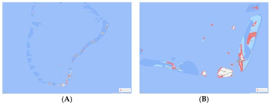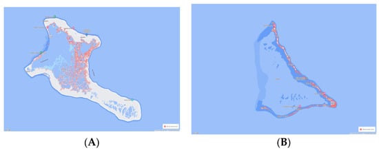 Inundation map (red color), Kiribati (A) and Tarawa (B) details, 1.5 m SLR [].