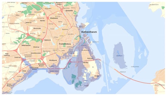 National regional map, Copenhagen; inundation risk 2120 (blue color), RCP 8.5. scenario [].