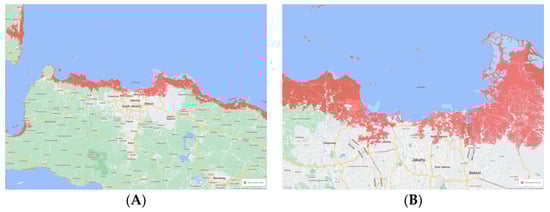 Inundation map, Jakarta (A,B), 2.5 m SLR (red color) [].