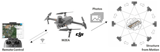 For the passive vision system, the DJI Mavic 2 Enterprise Advanced (M2EA) was used. This UAV has a true focal length of 9 mm and a ½″ CMOS sensor, is equipped with a high-quality camera, is less weighty, and can avoid obstacles, ensuring a safer flight. The photographs taken by the UAV-mounted sensor are used to generate point clouds based on an SfM approach, which can be used with several commercial and open-source scene reconstruction software packages. This streamline is shown in Figure 3.