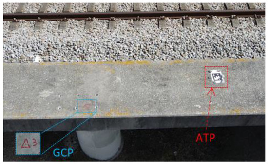 For georeferencing and photogrammetry, the railway bridge was identified utilizing 50 ground control points (GCPs) and 8 automatic tie points (ATPs). As seen in Figure 5, these targets were directly placed on the concrete surface of both the columns and the deck. The GCPs were measured utilizing topographic assistance, guaranteeing the precise and feasible dimensions, while the ATPs enabled automated image recognition in ContextCapture.