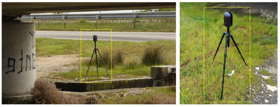 Laser scanning was executed using a high-density mode, leading to point density of 5 mm per 10 m. Consequently, the scanning setup was positioned within a distance of less than 10 m from the structure for each acquisition. In this mode, a complete scan, involving panoramic image capture, takes roughly 5 min due to the length of the bridge, and data collecting took over 12 h. Figure 6 displays the LiDAR system in operation. Table 1 specifies an overview of the collected data.