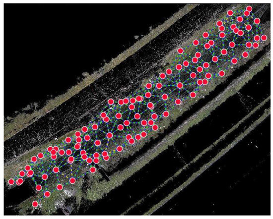 The data registration was manually performed, and then the iterative closest point (ICP) technique was used to optimize it. The ICP algorithm is a well-known method for rigid registration. It alternates between querying the target set for the nearest point and minimizing the distance between related points and guarantees convergence to the locally optimal alignment. The final registration stated an average mean inaccuracy of approximately 17 mm. Figure 7 depicts the point cloud that was registered, illustrating the spatial arrangement of the scanning stations. The distribution of these stations was deliberately executed to encompass diverse perspectives. Specifically, the lateral girder necessitated a minimum of three scans within each span, as well as an additional three scans surrounding each column. Similarly, beneath the deck, a minimum of five scans along the longitudinal axes were conducted per span.