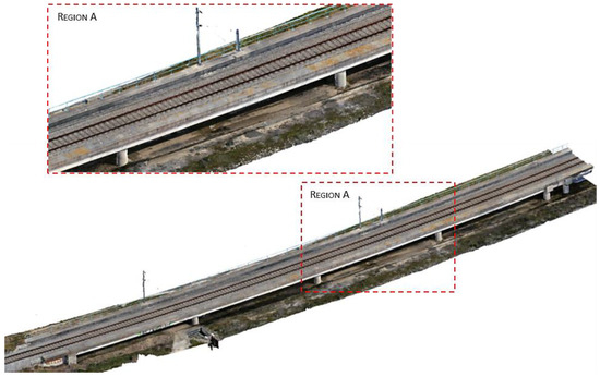 The model created in ContextCapture using TLS data includes the lateral and bottom deck components of the railway bridge and has a high level of accuracy (LOA), including the catenary wires (Figure 12a). The model built in ContextCapture using UAV image data, on the other hand, includes the lateral and upper deck components and has a a significant level of texture intricacy (Figure 12b).