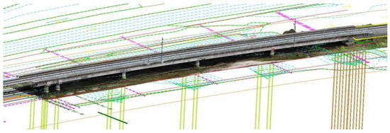 One of the outputs produced is a comparison between the as-is reality-captured model and the as-designed model. Additionally, a virtual visual inspection of the high-resolution textured as-is model is performed with no significant damage detected. The use of reality capture technology allows for the efficient and comprehensive recording of the condition state of an existing bridge, aiding in project quality inspection and acceptance by detecting geometric deviations. The combination of information from both representative models has been demonstrated to be highly effective, resulting in a unified georeferenced model, as shown in Figure 16.