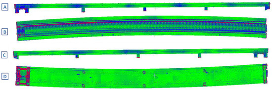 Deviation analysis seen from each view ((A)—lateral view (north); (B)—top view; (C)—lateral view (south); and (D)—bottom view).