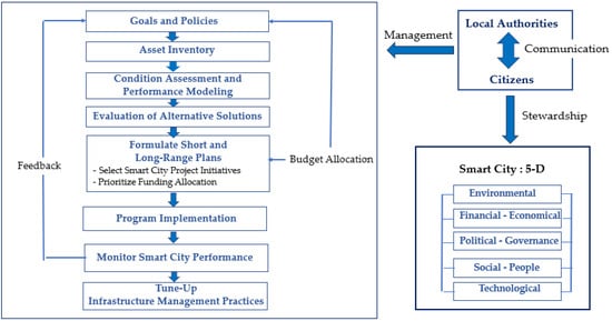 - The level of maturity of a smart city should be evaluated through the five dimensions model (5D): (1) environmental, (2) financial-economic, (3) political-governance, (4) social-people, and (5) technological. These five dimensions are the main components of the smart city conceptual approach presented in this paper as part of the infrastructure management framework.