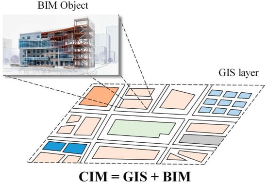- Building Information Modeling-City Information Modeling (BIM-CIM): Building information modeling (BIM) is a 3D modeling tool for urban planning and design that helps a city improve operational efficiency, assist stakeholders in decision making, and mitigate risks and vulnerabilities. The tool enables collaboration among architects, engineers, planners, and stakeholders by providing a platform to share data and information, thus creating interconnectivity among parties involved in a specific project. On the other hand, a geographic information system (GIS) is a platform to store urban data and information about the locations of buildings, topography, and occupancy. The development of city information modeling (CIM) is a relatively recent idea that was proposed to enable multi-hazard simulation using a unified database covering both individual buildings and urban areas. City information modeling (CIM) combines the spatial data representation of a geographic information system (GIS) with the richness of expressing individual building component information in BIM. Figure 4 shows the concept of city information modeling (CIM) integrating BIM and GIS [44].