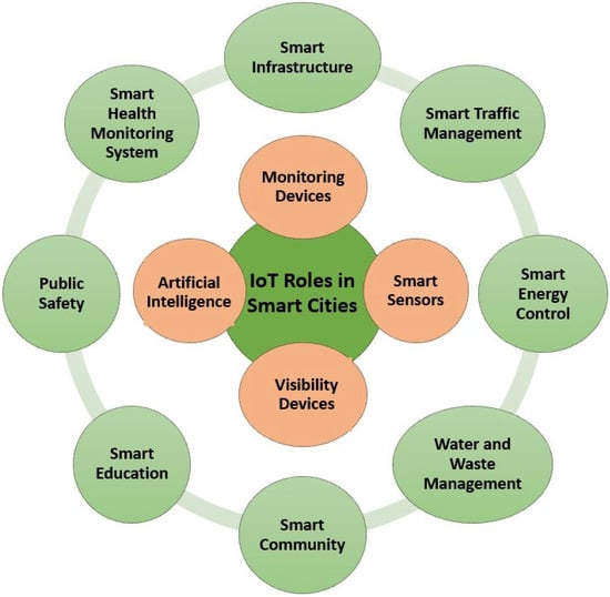 - Smart (IoT) devices: Using different devices such as smart sensors, monitoring devices, visibility devices, and AI for receiving and managing big data efficiently, IoT is enabling seamless urban interconnectivity and communication between different systems and infrastructures. IoT applications have made ground-breaking changes in different areas such as traffic control systems, energy consumption, and waste management. These advancements have resulted in optimizing resource allocation processes, reducing pollution, and saving time as a result of the adoption of sustainable practices. Cloud-based (IoT) applications facilitate real-time data management for citizens using smartphones in different areas of urban eco-systems with the participation of municipalities and enterprises.The Oslo Smart Street Lighting project is a prime example of an IoT application in smart cities. By incorporating smart sensors and utilizing internet-based apps, Oslo integrated the city’s street lighting into a remotely accessible network, resulting in approximately 70% energy savings through the deployment of 20,000 smart streetlights [47]. Figure 5 shows the various roles of IoT in smart cities by using different devices.