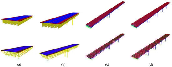 3D model of the proposed CPGS−benchmark (top) and CDLGS (bottom) deck systems used in this study: (a) single-span; (b) two-span; (c) three-span; and (d) five-span.