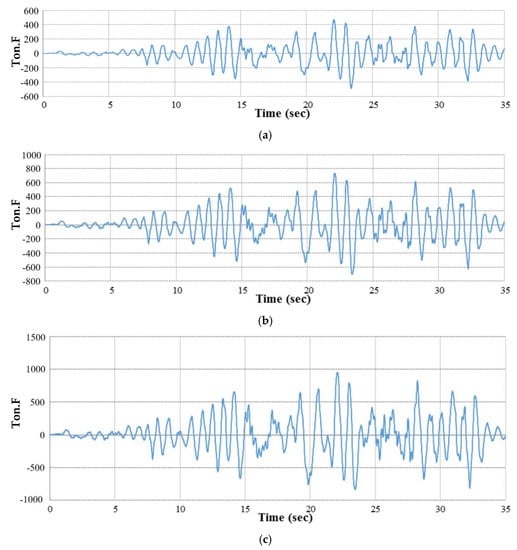 Base shear latitude (transversal) results of Tabas earthquake for magnifications: (a) 0.3 g; (b) 0.5 g; and (c) 0.7 g.